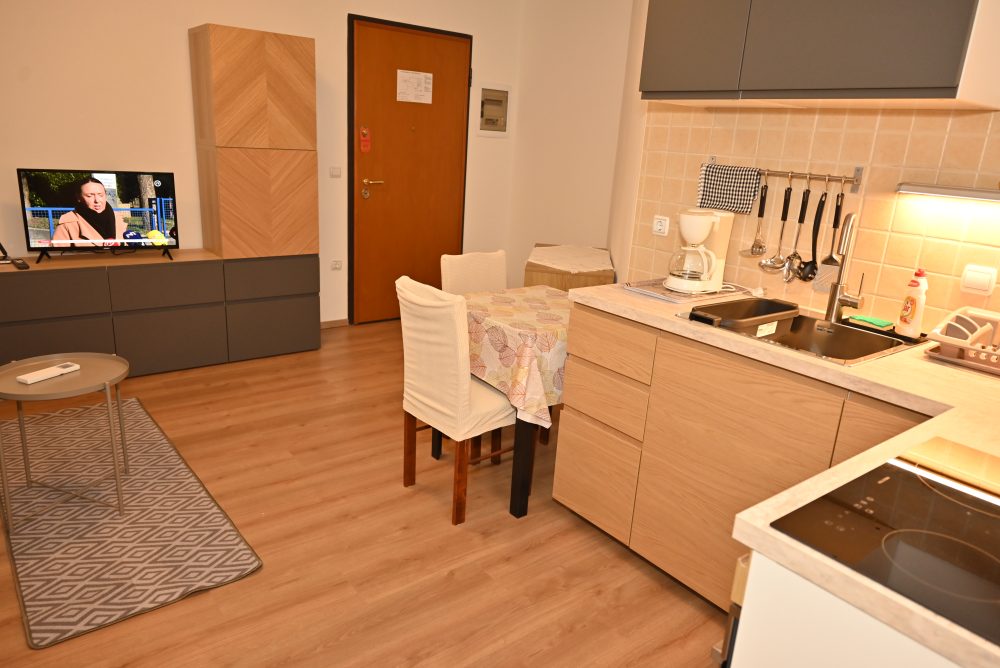 - Amenities: Balcony, Bathroom, Bedclothes, Coffee maker, Cooking plates, Cutlery, Free Wi-Fi, Hair dryer, Kettle, Kitchen, Kitchen table, Kitchen utensils, Refrigerator, Seating area, Shower cabin, Sleeping room, Socket next to the bed, Toilet, Toilet paper, Towels, TV, Wardrobe, Wooden or parquet floor
